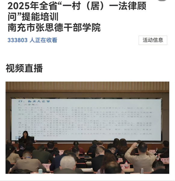 2025年12月10日,由四川省司法厅举办的全省“一村(居)一法律顾问”培训以“线下线上”相结合的方式在南充举行,四川欣锐律所叶洋、李军、韦强文、胡勤等律师积极响应号召,通过直播线上全过程参与此次培训,并取得了良好的学习效果。